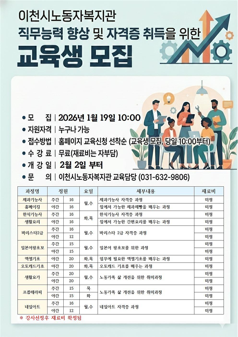 2026년도 이천시 노동자 종합 복지관 평생교육 직무향상 및 자격취득 과정 교육생을 모집합니다.
